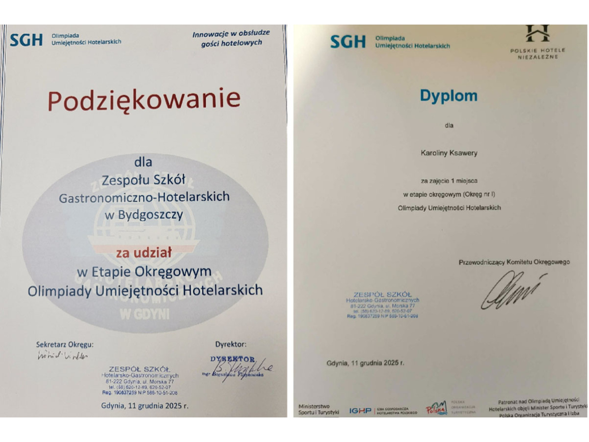 23 grudnia 2025 opublikowane zostały wyniki etapu okręgowego IV edycji Olimpiady Umiejętności Hotelarskich, który odbył się 11 grudnia. Reprezentanci naszej szkoły Karolina Ksawery 5TH oraz Tymoteusz Słysz 4KH przystąpili do zmagań olimpijskich w Zespole Szkół Hotelarsko-Gastronomicznych w Gdyni. Hasłem przewodnim tegorocznej edycji są „Innowacje w obsłudze gości hotelowych”. Organizatorem OUH jest Szkoła Główna Handlowa w Warszawie. Olimpiada odbywa się pod patronatem Ministra Sportu i Turystyki. Zawody okręgowe przebiegają dwuczęściowo. W pierwszej kolejności uczestnicy przystępują do rozwiązania testu zawierającego 40 zadań sprawdzających wiadomości i umiejętności w zawodzie technik hotelarstwa oraz z zakresu tematyki wiodącej. Po teście wykonują zadanie praktyczne z elementami języka angielskiego, które ma na celu sprawdzenie umiejętności w obsłudze gościa hotelowego. Czas przeznaczony na wykonanie zadań to 90 minut. Karolina bardzo dobrze poradziła sobie zarówno z testem jak i zadaniem praktycznym. Z obu części uzyskała 100 punktów. Wynik ten zapewnił jej 1 miejsce w okręgu, nagrodę rzeczową (tablet) ufundowaną przez ZSH-G w Gdyni oraz awans do etapu centralnego, w którym powalczy o tytuł laureatki. Nasza uczennica znalazła się w gronie 38 najlepszych hotelarzy w Polsce wyłonionych spośród 387, którzy przystąpili do etapu okręgowego w 12 okręgach. Tymoteuszowi z wynikiem 90 punktów niestety nie udało się zakwalifikować do rozgrywek finałowych. Naszym reprezentantom dziękujemy za udział i zaangażowanie. Karolinie gratulujemy sukcesu i życzymy powodzenia w finale, który odbędzie się w terminie 23-24.03.2026.