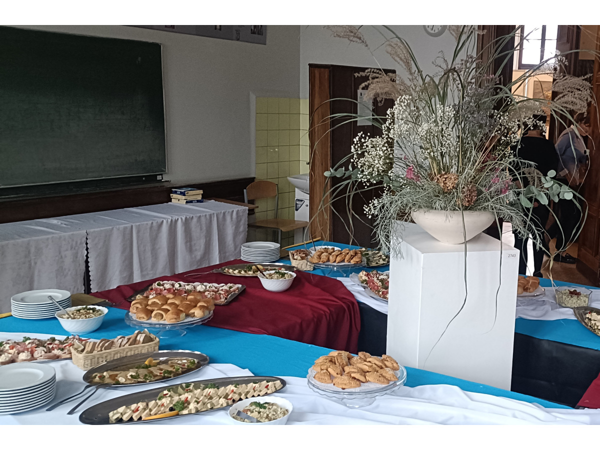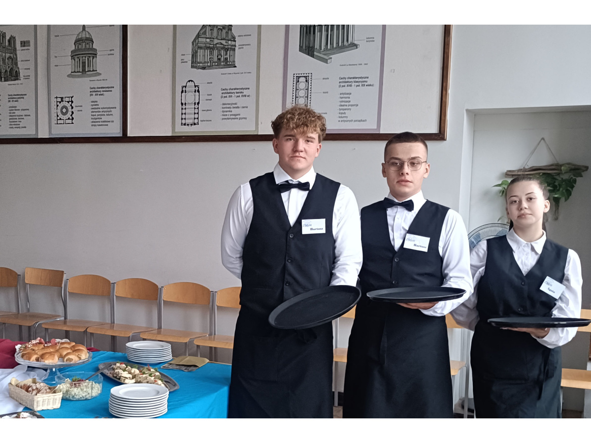 24.10.2025 r. mieliśmy przyjemność włączyć się w obchody 80 – lecia Liceum Plastycznego w Bydgoszczy. Zapewniliśmy poczęstunek dla zaproszonych gości, nauczycieli, uczniów i absolwentów. Wszyscy byli zachwyceni doskonałymi smakami, sposobem serwowania oraz wspaniałą obsługą młodzieży z klas 2KT i 3KH: Laurę Eckert, Oskara Paradowskiego, Bartosza Rydziewskiego i Jędrzeja Łącznego.