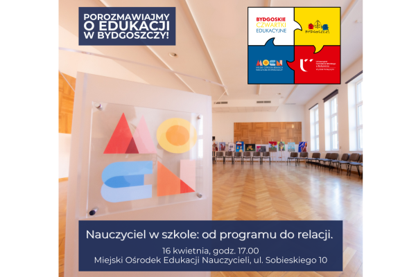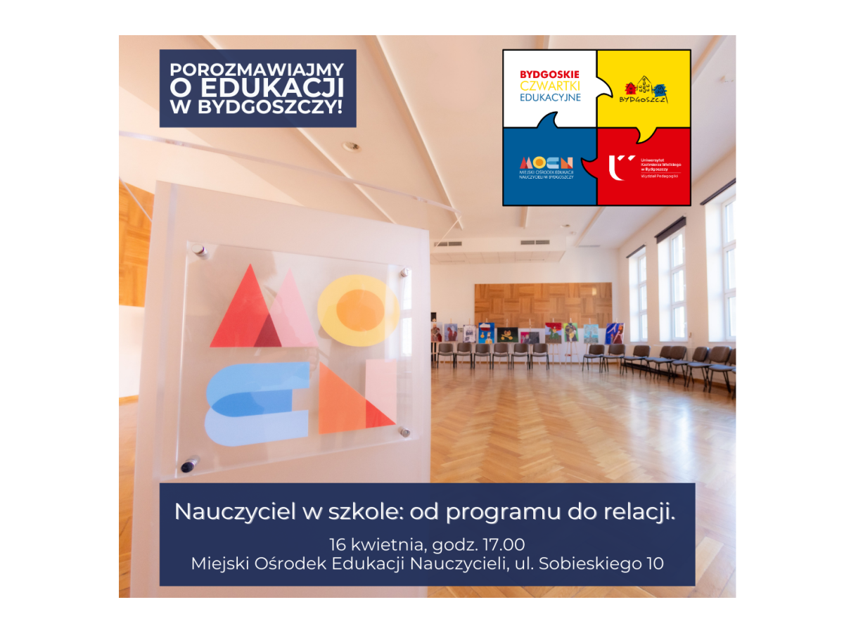 Miasto Bydgoszcz, Miejski Ośrodek Edukacji Nauczycieli i Wydział Pedagogiki Uniwersytetu Kazimierza Wielkiego zapraszają na spotkania w ramach wspólnego projektu pod nazwą „Bydgoskie Czwartki Edukacyjne”, które stały się okazją do wymiany doświadczeń, refleksji oraz wspólnego poszukiwania rozwiązań na najważniejsze wyzwania stojące przed współczesną szkołą.