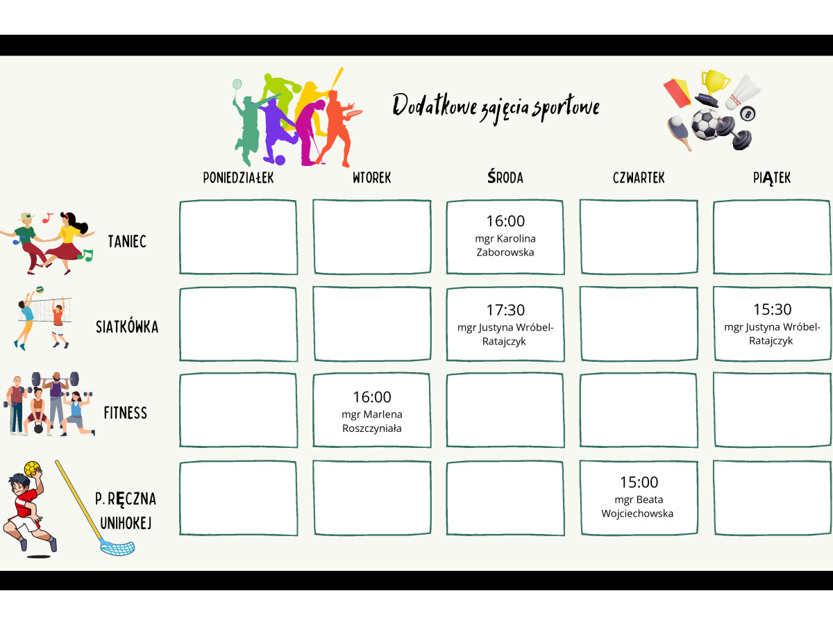 Nauczycielki w-f zapraszają chętnych uczniów na dodatkowe zajęcia sportowe, które będą się odbywały według załączonego harmonogramu.