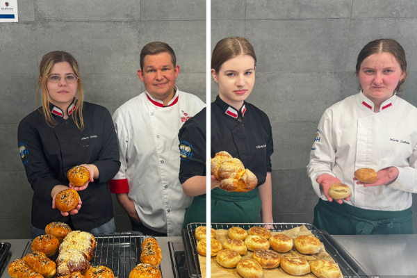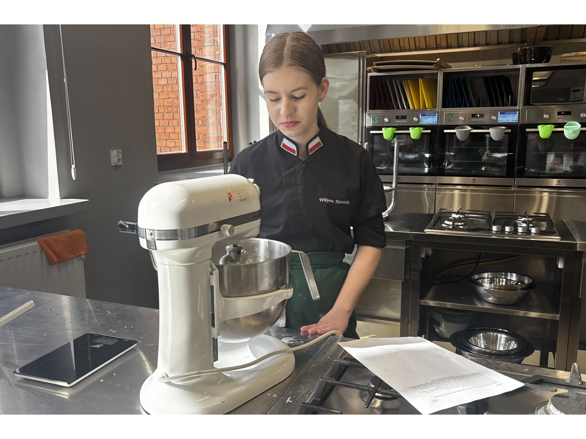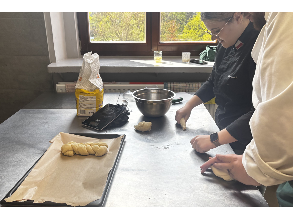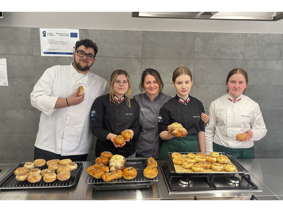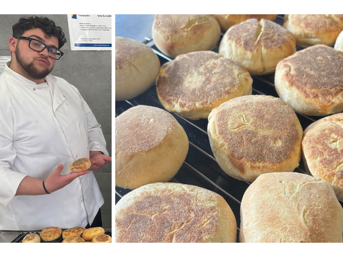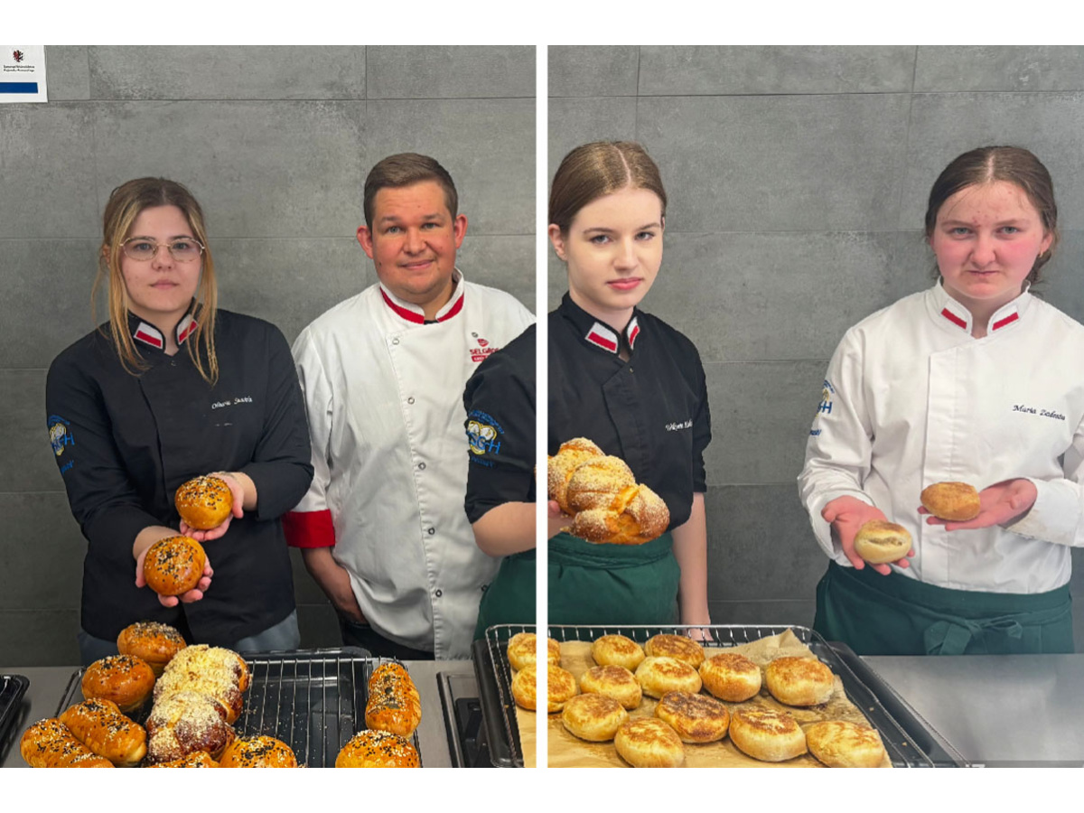 Podczas zajęć w ramach innowacji gastronomicznej „GastroPiekarnia” uczniowie mieli okazję zgłębić tajniki nowoczesnego piekarnictwa, łącząc teorię z intensywną praktyką. Tematem przewodnim było przygotowanie uniwersalnego ciasta na bazie metody tangzhong, które wykorzystano do wypieku bułek do burgerów i hot dogów. Dodatkowo powstały angielskie muffiny oraz tradycyjne chałki. Zajęcia zostały przeprowadzone przez absolwenta naszej szkoły Adama Rzęskiego – pasjonata dobrego pieczywa oraz kucharza pracującego na co dzień w Hotelu Park w Bydgoszczy. Podczas spotkania podzielił się on swoją wiedzą oraz doświadczeniem zawodowym, pokazując uczniom praktyczne zastosowanie poznanych technik w realiach pracy w gastronomii.
