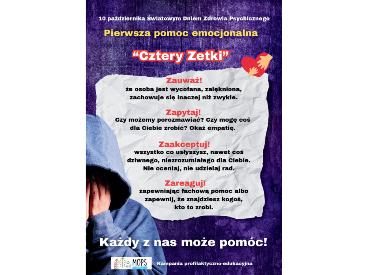 Co roku 10 października obchodzony jest Światowy Dzień Zdrowia Psychicznego, w związku z tym Miejski Ośrodek Pomocy Społecznej w Bydgoszczy, zwraca się z prośbą o skierowaniu do uczniów i ich rodziców informacji, dotyczącej Kampanii profilaktyczno-edukacyjnej „Pierwsza pomoc emocjonalna Cztery Zetki”.