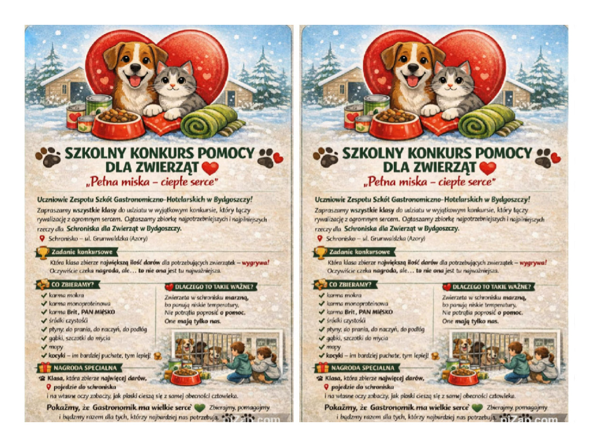 Zima to wyjątkowo trudny czas – nie tylko dla nas, ale przede wszystkim dla tych, którzy nie mają własnego domu, ciepłego kąta ani kochających ramion. W schroniskach każdego dnia na pomoc czekają psy i koty, które z nadzieją wypatrują człowieka. Teraz, gdy temperatury spadają, nasza empatia i szybkie działanie są bezcenne. Zapraszamy całą społeczność szkolną ZSG-H do udziału w szkolnym konkursie charytatywnym. Zadaniem każdej klasy będzie zebranie najpotrzebniejszych rzeczy dla schroniska, takich jak: