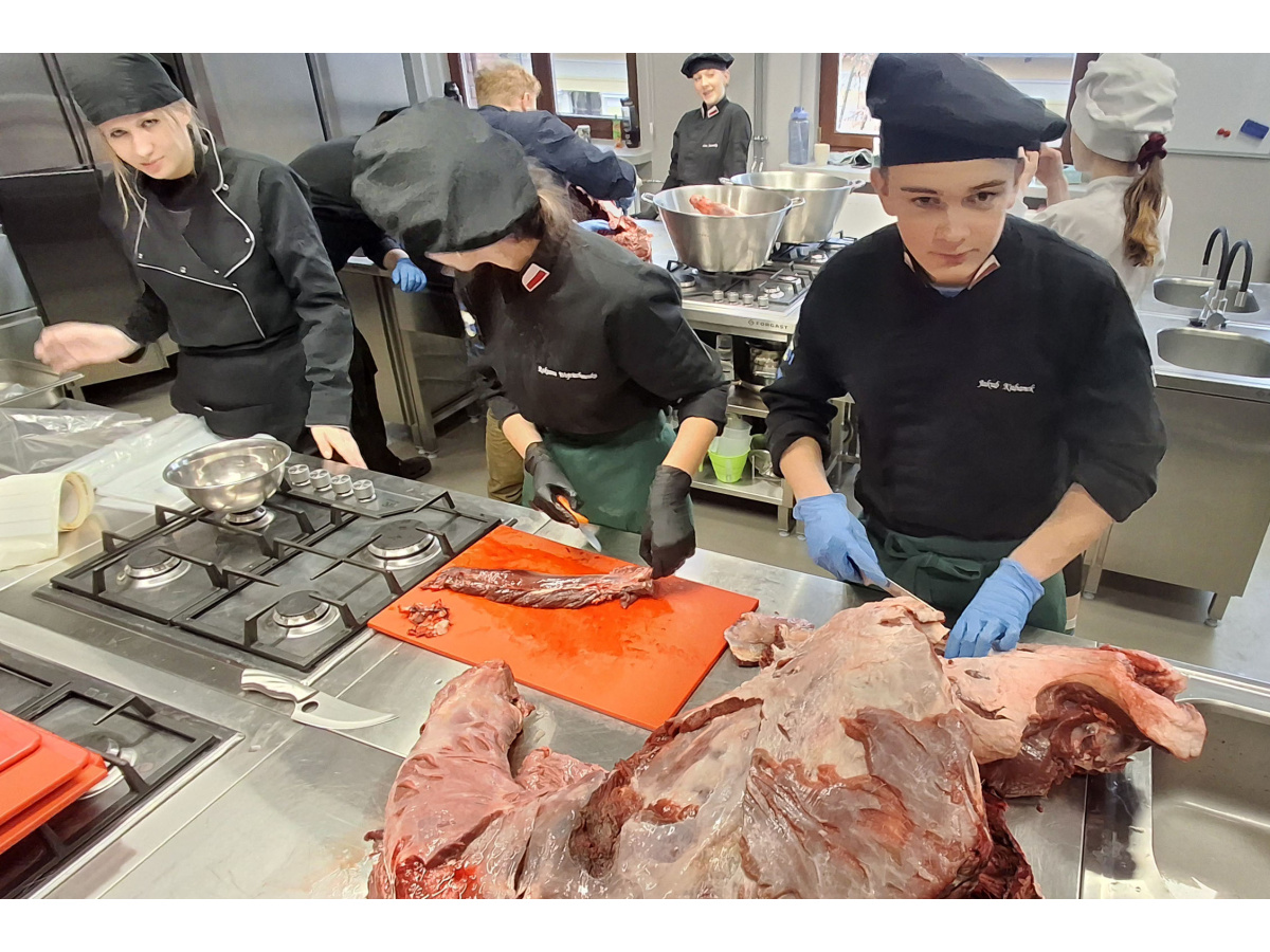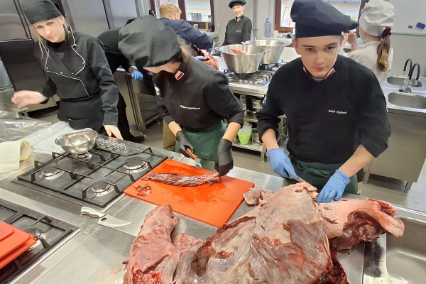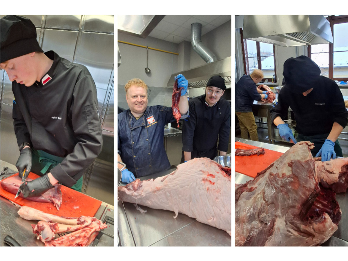 Była to cenna lekcja pozwalająca poszerzyć wiedzę z anatomii mięsa, prawidłowego trybowania i zasad bezpieczeństwa. Uczniowie mieli możliwość pracy z surowcem rzadziej spotykanym na co dzień, co stanowi ważny element przygotowania do przyszłej pracy w branży gastronomicznej. Podziękowania kierujemy do Przedsiębiorstwa Usług Energetycznych WERGON za bezinteresowną pomoc finansową, dzięki której mogliśmy zakupić tusze zwierząt. Dziękujemy również Nadleśnictwu Zamrzenica i Panu Markowi Grugel za zorganizowanie zakupu i transportu tusz.