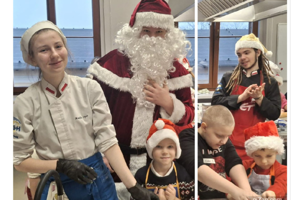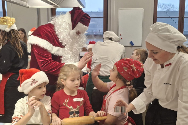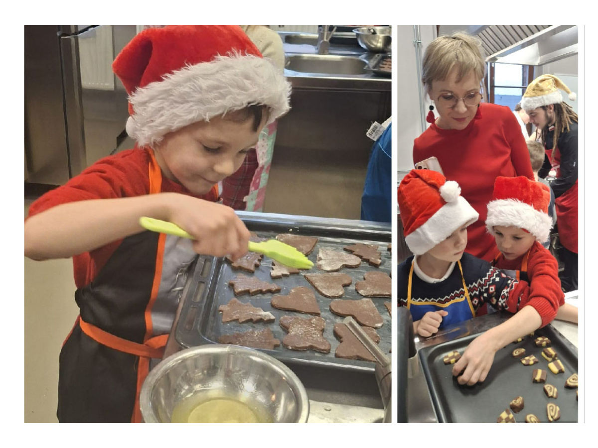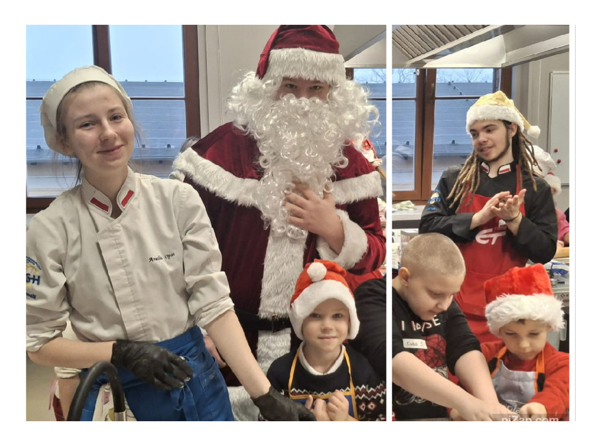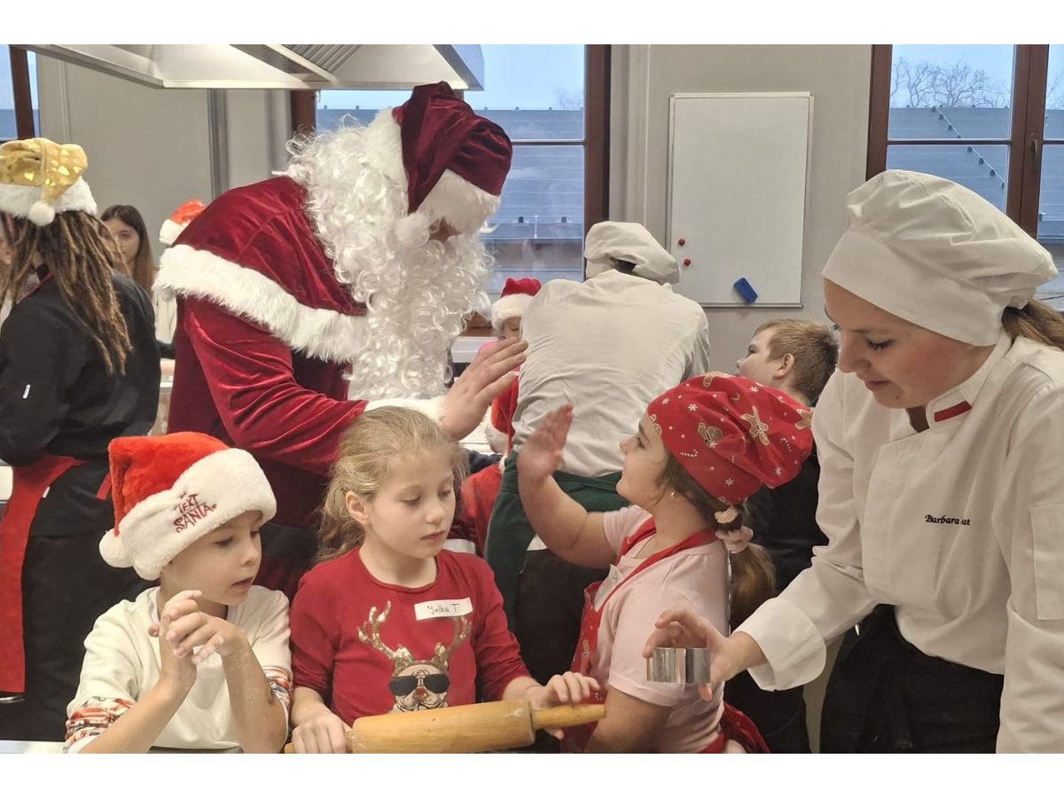 Klasa 1b ze Szkoły Podstawowej nr 45 w Bydgoszczy odwiedziła naszą szkołę. Dzieci wraz ze starszymi kolegami z klasy 4aTG brały udział w świątecznych warsztatach kulinarnych. Wspólnie wypiekali i dekorowali pierniczki oraz przygotowali pizzerinki. Na koniec spotkania była wspólna degustacja. Nasi goście byli bardzo ciekawi i chętni do pracy. Nie obyło się bez niespodzianki - odwiedził nas św. Mikołaj, który pomagał podczas pracy i obdarował wszystkich cukierkami. Razem zaśpiewaliśmy kolędy i świetnie się bawiliśmy.