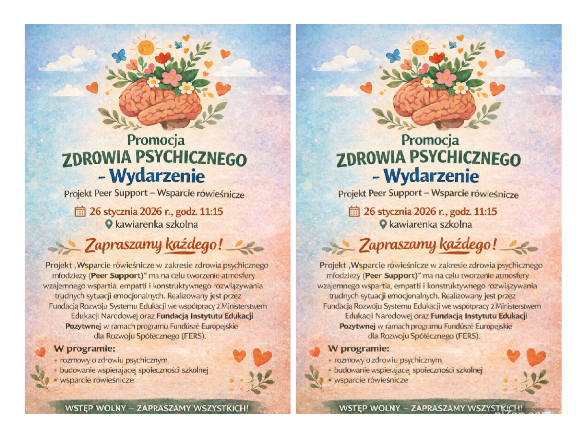 Zapraszamy uczniów naszej szkoły na wyjątkowe spotkanie, które odbędzie się w poniedziałek 26 stycznia 2026 w godzinach 11:15-14:00 w kawiarence szkolnej. Stawiamy na rozmowę, relacje, wzajemne wsparcie. Przy wspólnym stole, w luźniej atmosferze poruszymy ważne dla nas tematy. Wspólnie odkryjemy, że rozmowa z drugim człowiekiem jest najskuteczniejszym lekarstwem na codzienny stres. Podczas spotkania schoolworkerzy opowiedzą o programie Peer Support (wsparciu rówieśniczym) i o tym jak wspólnie budować bezpieczną przestrzeń w naszej szkole.