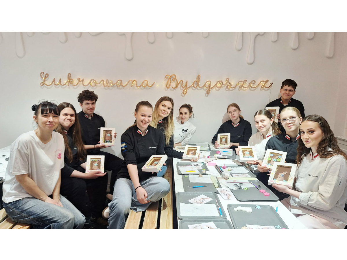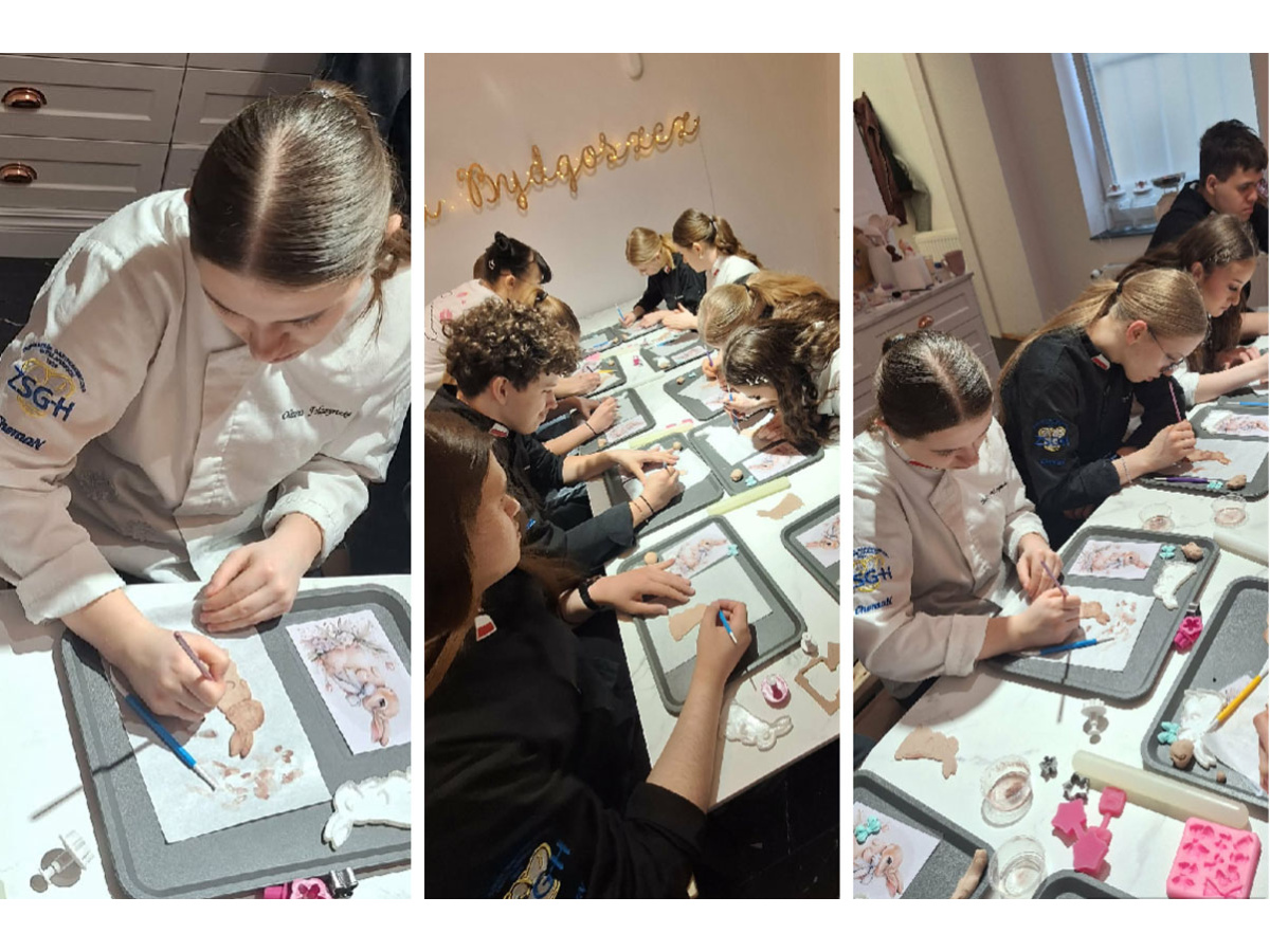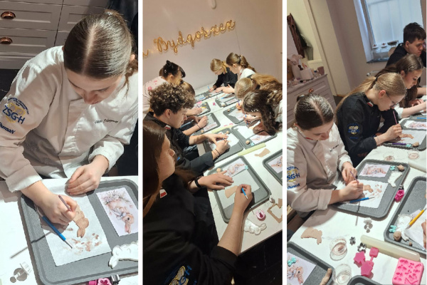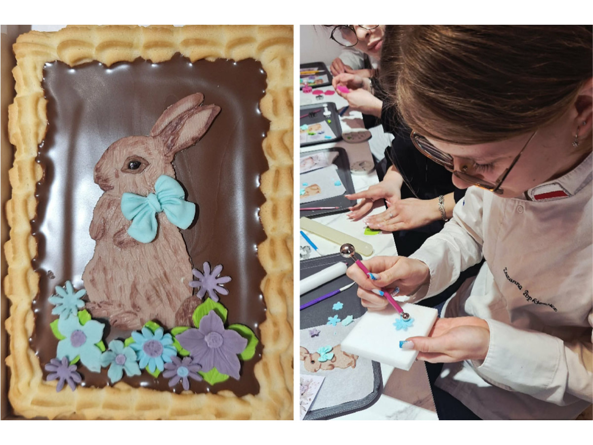W poniedziałek 30 marca klasa 4bTG uczestniczyła w warsztatach dekorowania mazurków wielkanocnych w pracowni artystycznej Jowity Woszczyńskiej. Uczniowie na przygotowane wcześniej korpusy ciasta kruchego nakładali wykonane przez siebie elementy z masy cukrowej. Wydawać by się mogło, że to zabawa dla dzieci, ale tradycje świąteczne cieszą i małych i dużych. Dowodem na to było zaangażowanie w pracę i radość na twarzach uczniów.