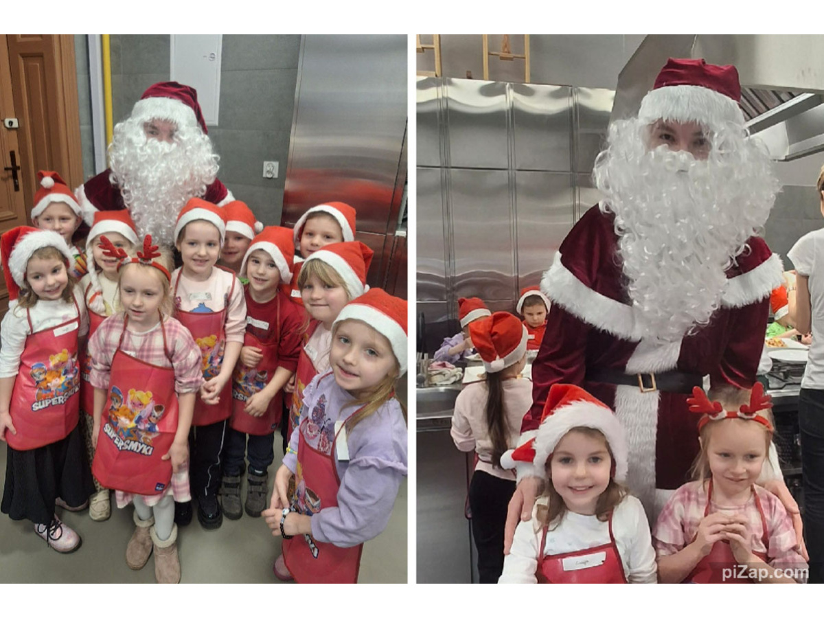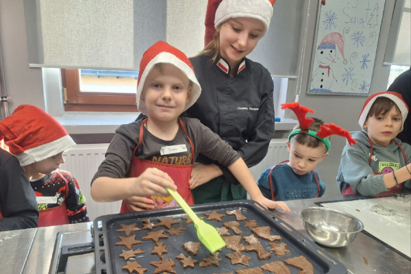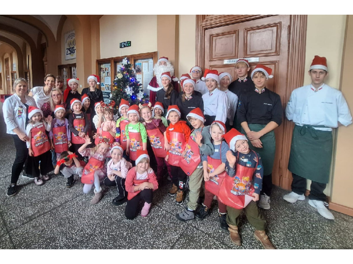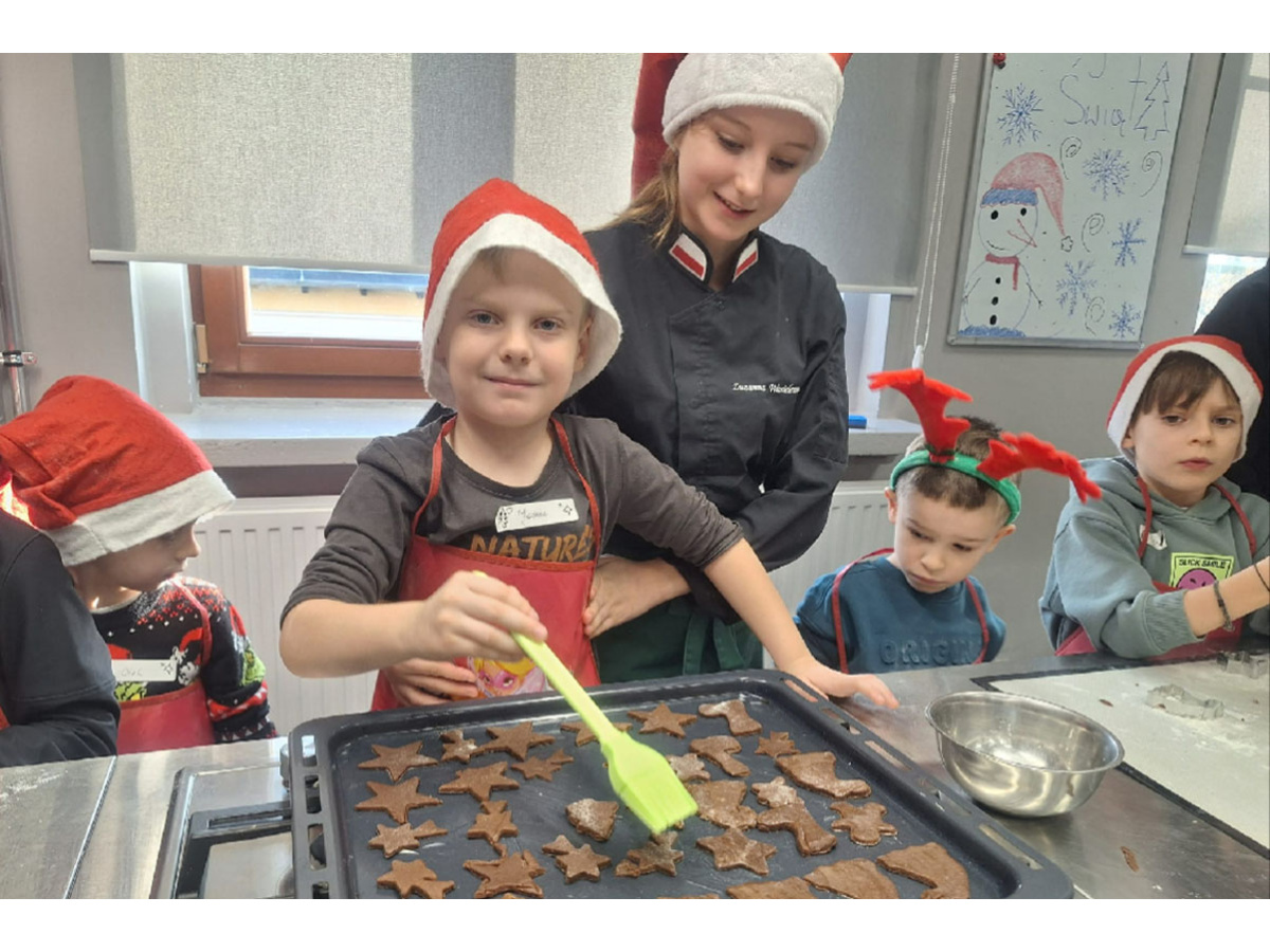 Grupa ,,Puchatki” z Przedszkola Sióstr Elżbietanek w Bydgoszczy odwiedziła naszą szkołę. Dzieci wraz ze starszymi kolegami z klasy 2aTG brały udział w świątecznych warsztatach kulinarnych. Wspólnie wypiekali i dekorowali pierniczki oraz ciasteczka kruche. Przedszkolaki były bardzo ciekawe, chętne do pracy i wszyscy świetnie się bawiliśmy. Nie obyło się bez niespodzianki - odwiedził nas św. Mikołaj, który pomagał podczas pracy i obdarował cukierkami. Śpiewaliśmy kolędy, a „Puchatki” pochwaliły się świątecznymi piosenkami. Na koniec spotkania była wspólna degustacja wypieków. Bardzo dziękuję młodzieży za zaangażowanie, wspólną pracę i opiekę nad dziećmi.