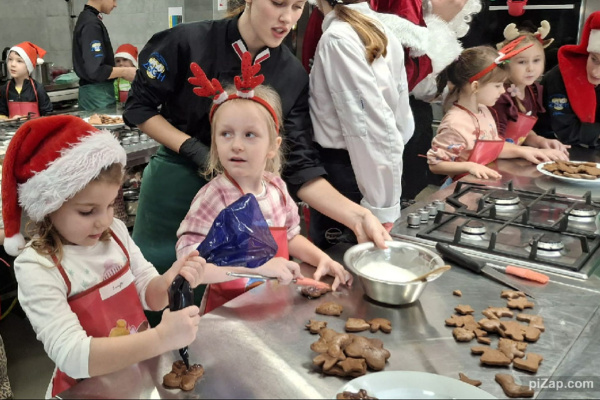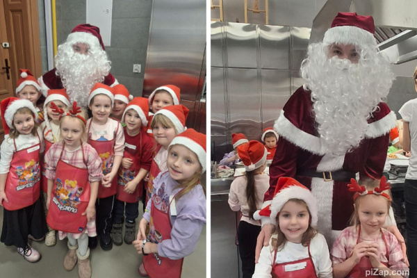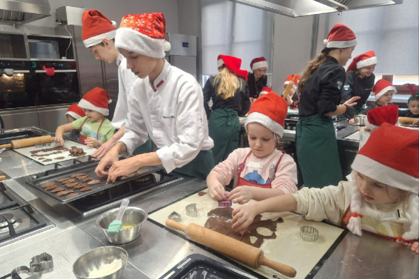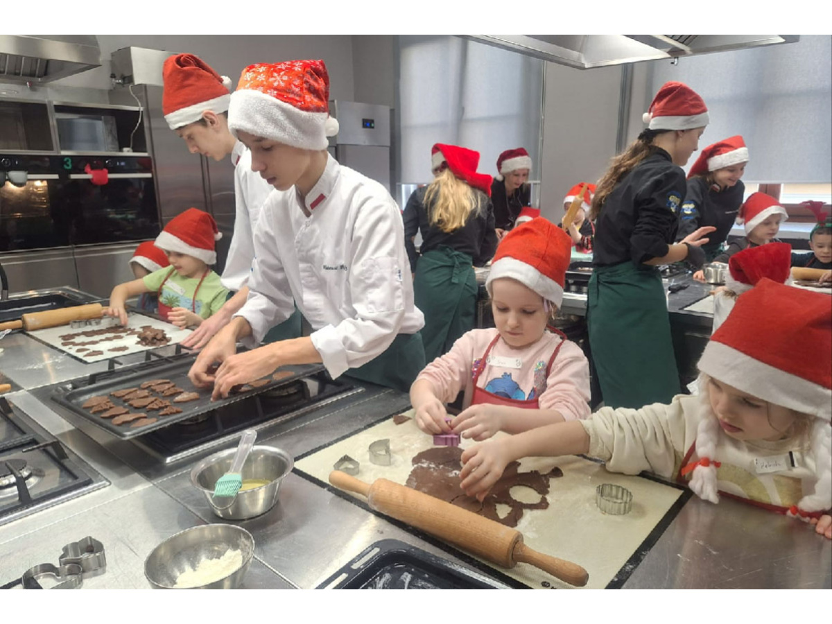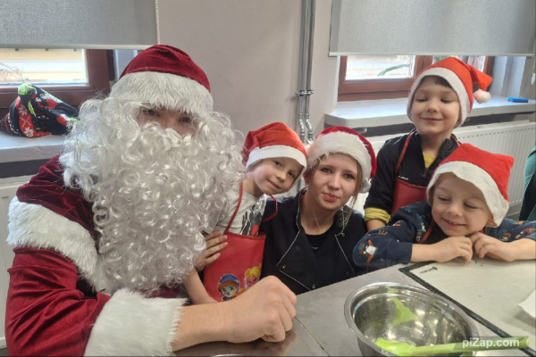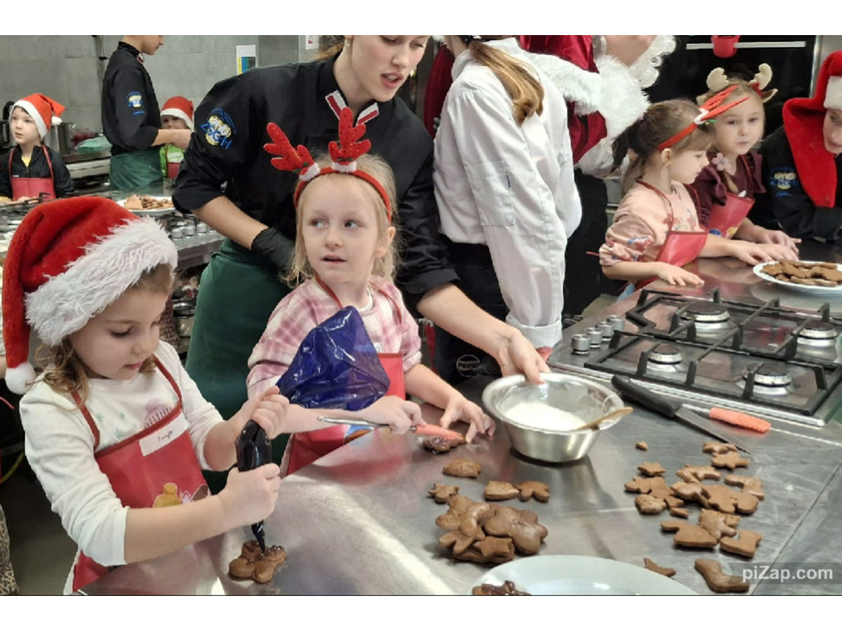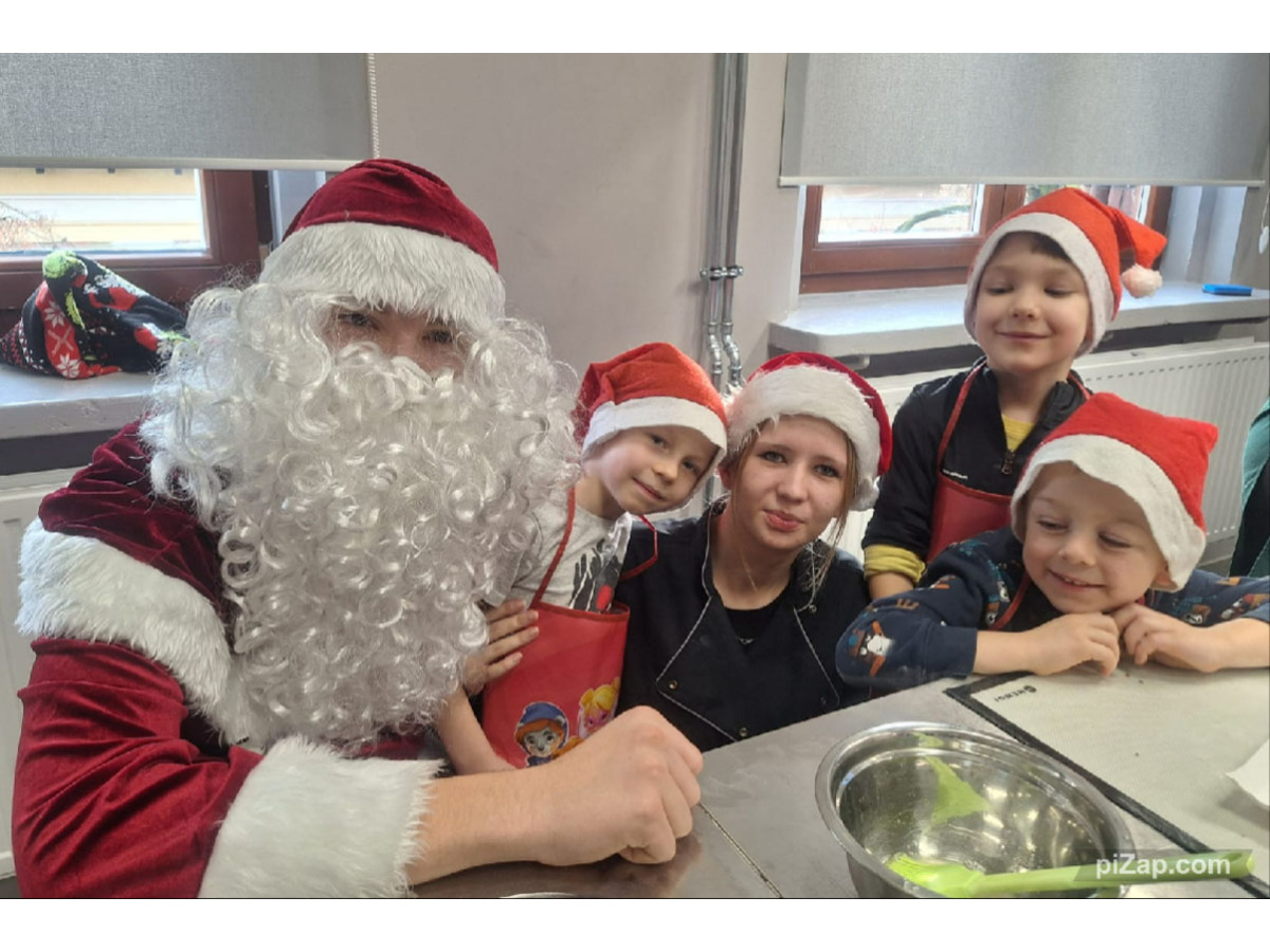 Grupa ,,Puchatki” z Przedszkola Sióstr Elżbietanek w Bydgoszczy odwiedziła naszą szkołę. Dzieci wraz ze starszymi kolegami z klasy 2aTG brały udział w świątecznych warsztatach kulinarnych. Wspólnie wypiekali i dekorowali pierniczki oraz ciasteczka kruche. Przedszkolaki były bardzo ciekawe, chętne do pracy i wszyscy świetnie się bawiliśmy. Nie obyło się bez niespodzianki - odwiedził nas św. Mikołaj, który pomagał podczas pracy i obdarował cukierkami. Śpiewaliśmy kolędy, a „Puchatki” pochwaliły się świątecznymi piosenkami. Na koniec spotkania była wspólna degustacja wypieków. Bardzo dziękuję młodzieży za zaangażowanie, wspólną pracę i opiekę nad dziećmi.