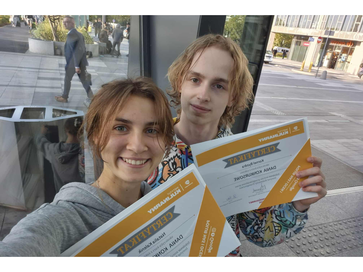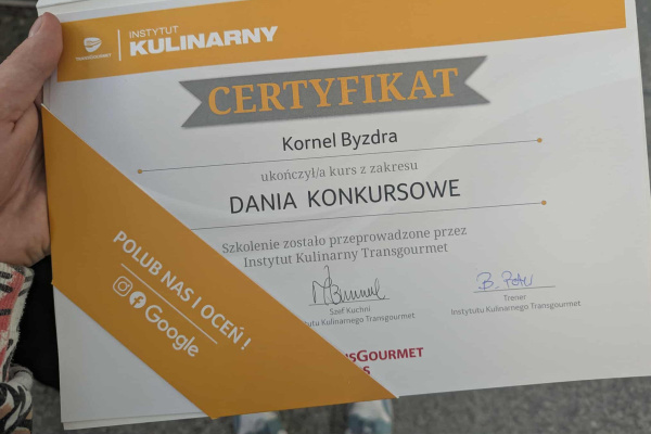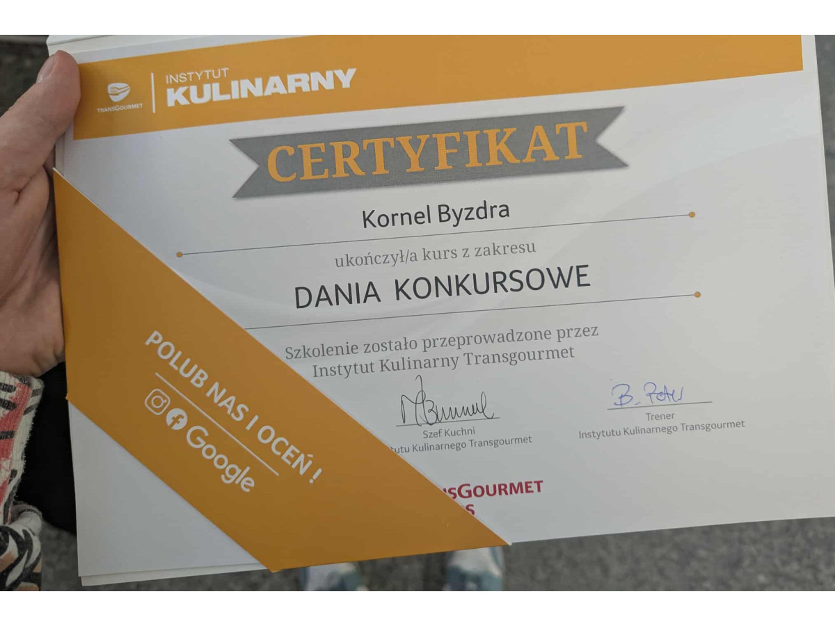 23 września 2025 uczeń klasy 4dTG - Kornel Byzdra odbył indywidualne szkolenie w Instytucie Kulinarnym Transgourmet w Warszawie. Była to jedna z nagród, które otrzymał za drugie miejsce w konkursie ogólnopolskim Chefs en Or. Szkolenie prowadził Bartosz Peter - kapitan Narodowej Reprezentacji Kucharzy. Tematem warsztatów były dania konkursowe. Kornel przygotował: łososia z ogórkiem i chrzanem, kurczaka z grzybami po staropolsku oraz sticky toffee pudding ze śliwką.