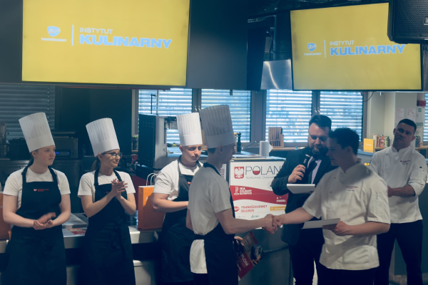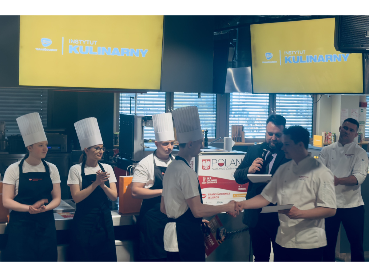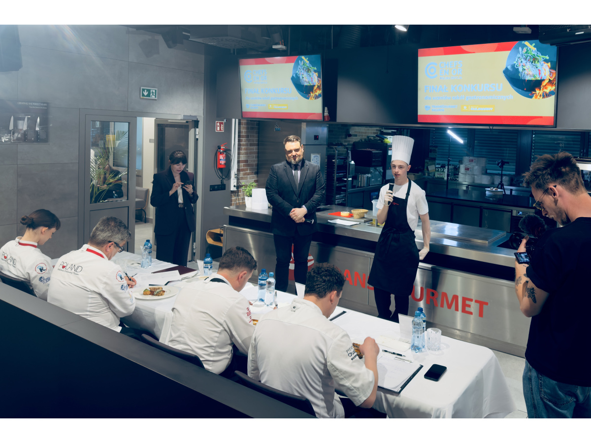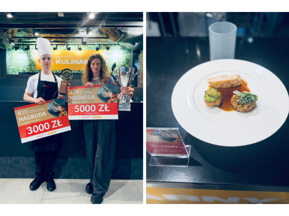 29 kwietnia odbył się Chefs en Or Polska edycja - prestiżowy konkurs kulinarny dla uczniów szkół gastronomicznych. Zdobycie pierwszego miejsca przez Kornela Byzdrę to ogromne wyróżnienie i potwierdzenie pasji, którą włożył w tworzenie wyjątkowego dania. Jury doceniło nie tylko smak i estetykę potrawy, ale także kreatywność oraz dbałość o każdy detal. To osiągnięcie motywuje do dalszego rozwoju i poszukiwania nowych inspiracji kulinarnych. Kornel przygotował smażoną pierś z kurczaka w glazurze limonkowo- miodowej z jusem drobiowym „5 smaków” podaną z ryżem smażonym, shiso w tempurze, krokietem imbirowym z chili, majonezem szczypiorkowym i sałatką z ogórka z sezamem. Nagrodami w tym konkursie są: 3000 zł, szkolenie indywidualne w Instytucie Kulinarnym Transgourmet, szkolenie indywidualne dla szkoły laureata, nagrody rzeczowe oraz bon na zakupy w Selgros dla szkoły w wysokości 5000 zł.