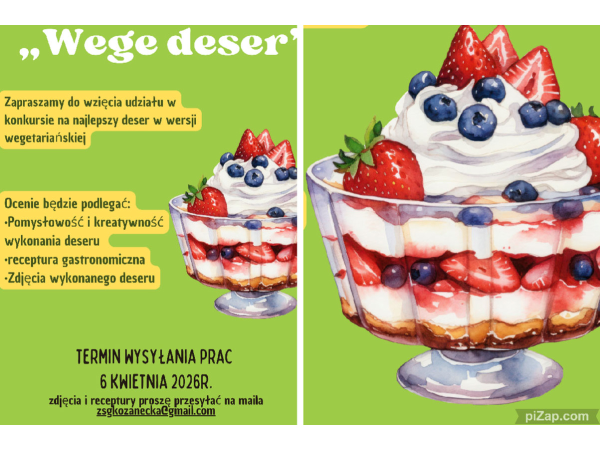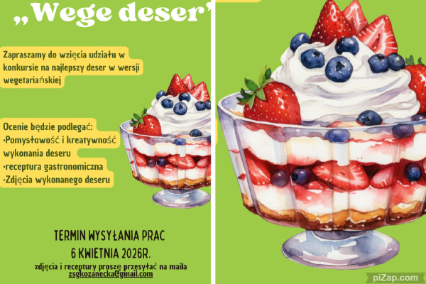 Zapraszamy do wzięcia udziału w konkursie na najlepszy deser w wersji wegetariańskiej. Zadanie konkursowe polega na przygotowaniu deseru, przesłaniu receptury i zdjęć samodzielnie przygotowanego deseru - zdjęcia proszę przesyłać na maila zsgkozanecka@gmail.com do 6 kwietnia 2026r.